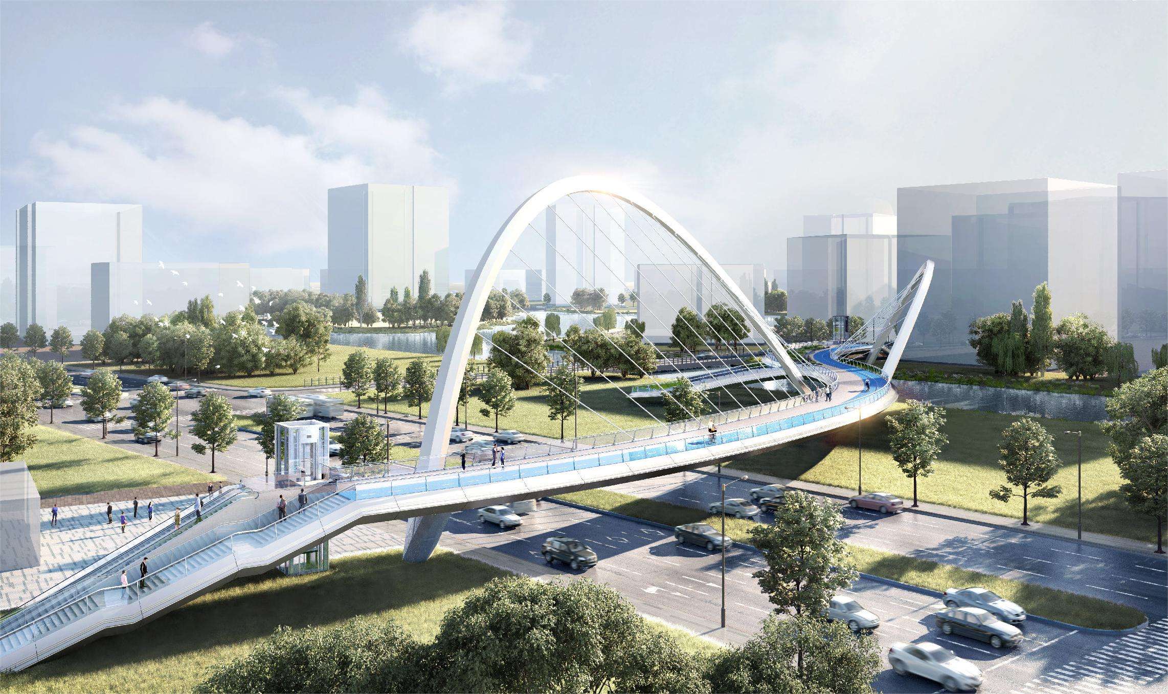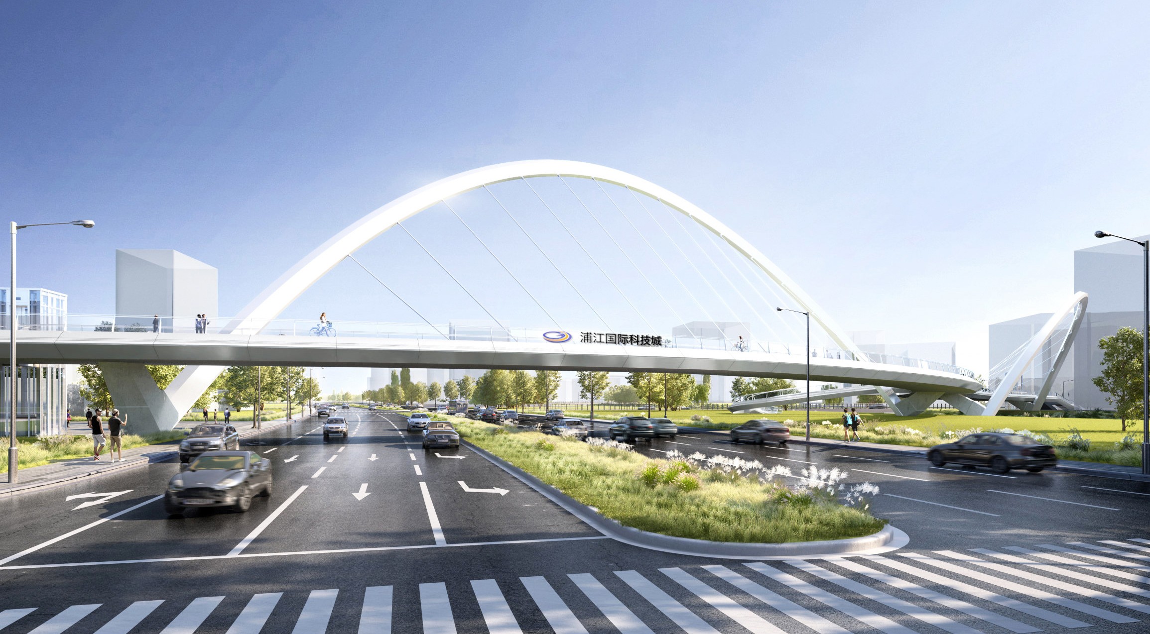 项目位于国家级产业园区——漕河泾浦江高科技园的核心位置。本项目桥体建成后将跨越陈行公路及周浦塘河,联通八号线浦江镇站及未来的东方智媒城。本桥采用斜拉拱结构形式,桥体总长224m,主跨度106.8m,总投资约9000万。